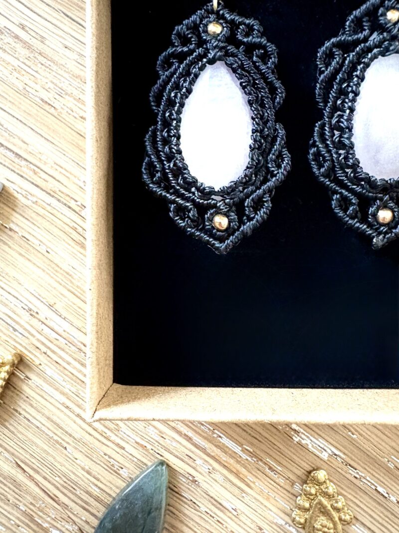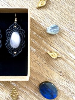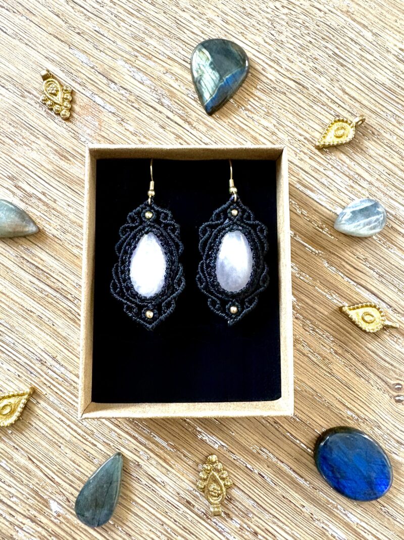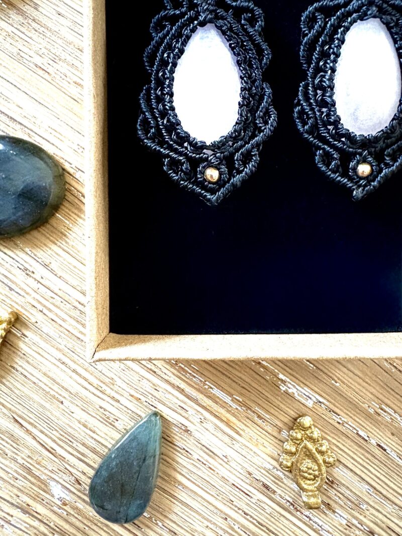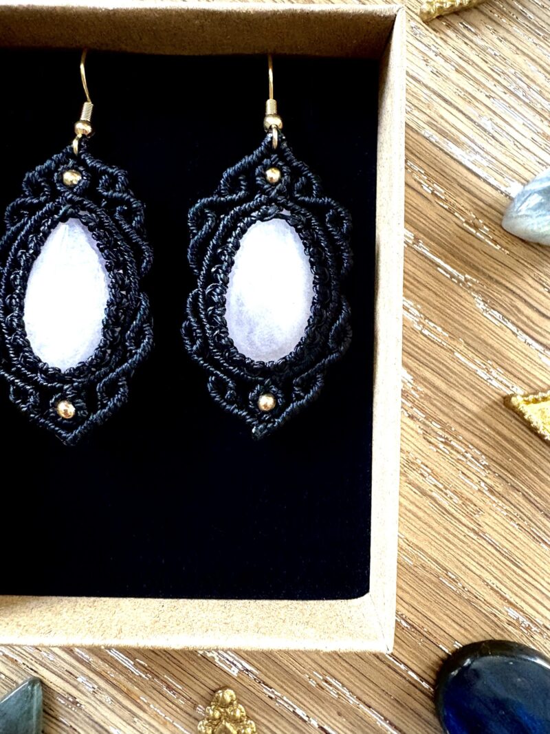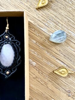 Ornées de quartz rose, chaque paire est soigneusement réalisée à la main, alliant l’art du macramé à la beauté naturelle du quartz rose, connue pour rééquilibrer les énergies du corps afin d’apaiser l’esprit et favoriser le bien-être.