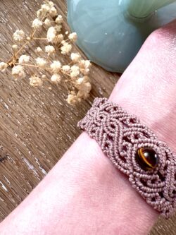 Bracelet macramé marron glacé avec perle œil de tigre, design arabesques. Bijou fait main, favorisant confiance et concentration.