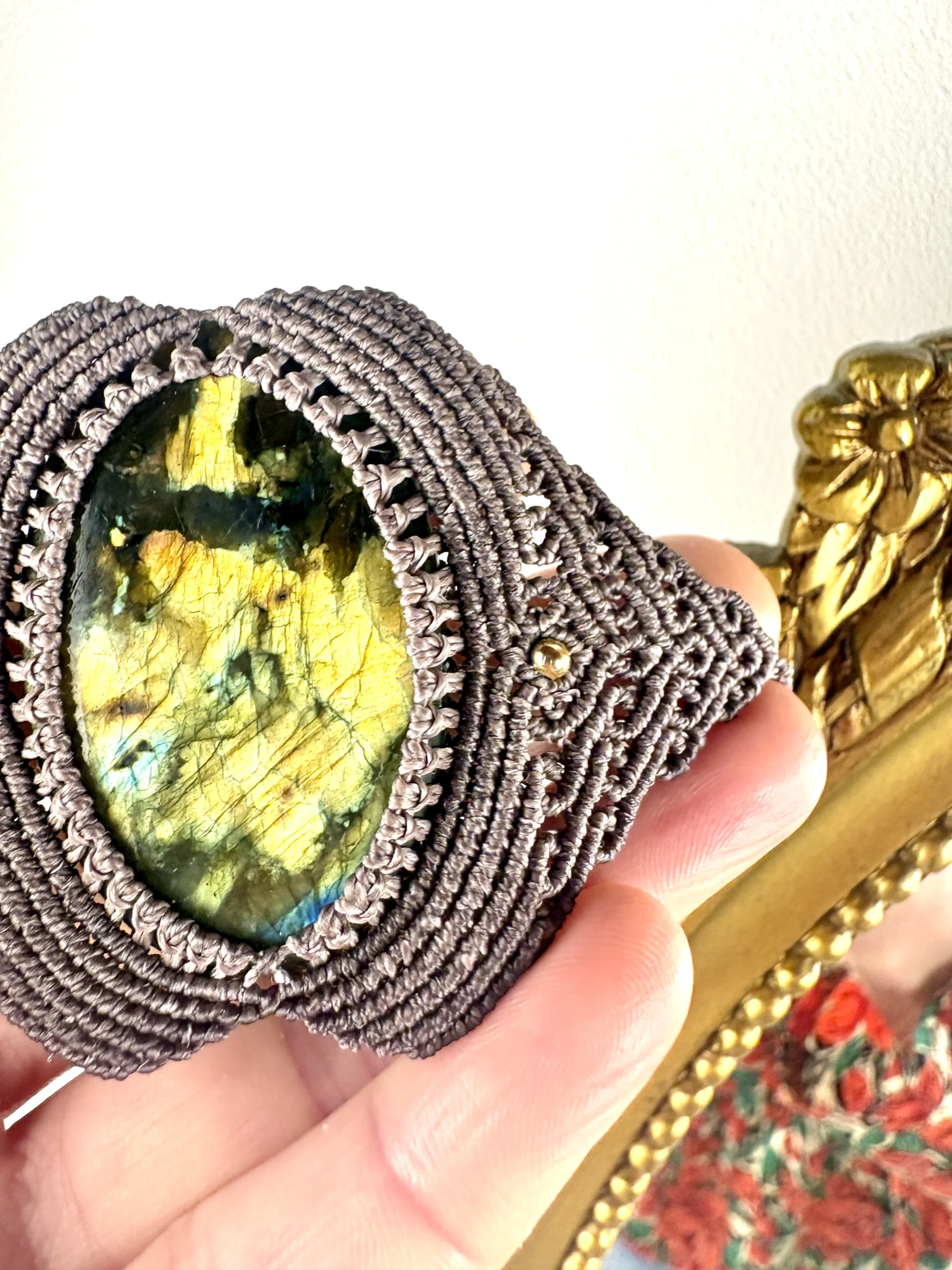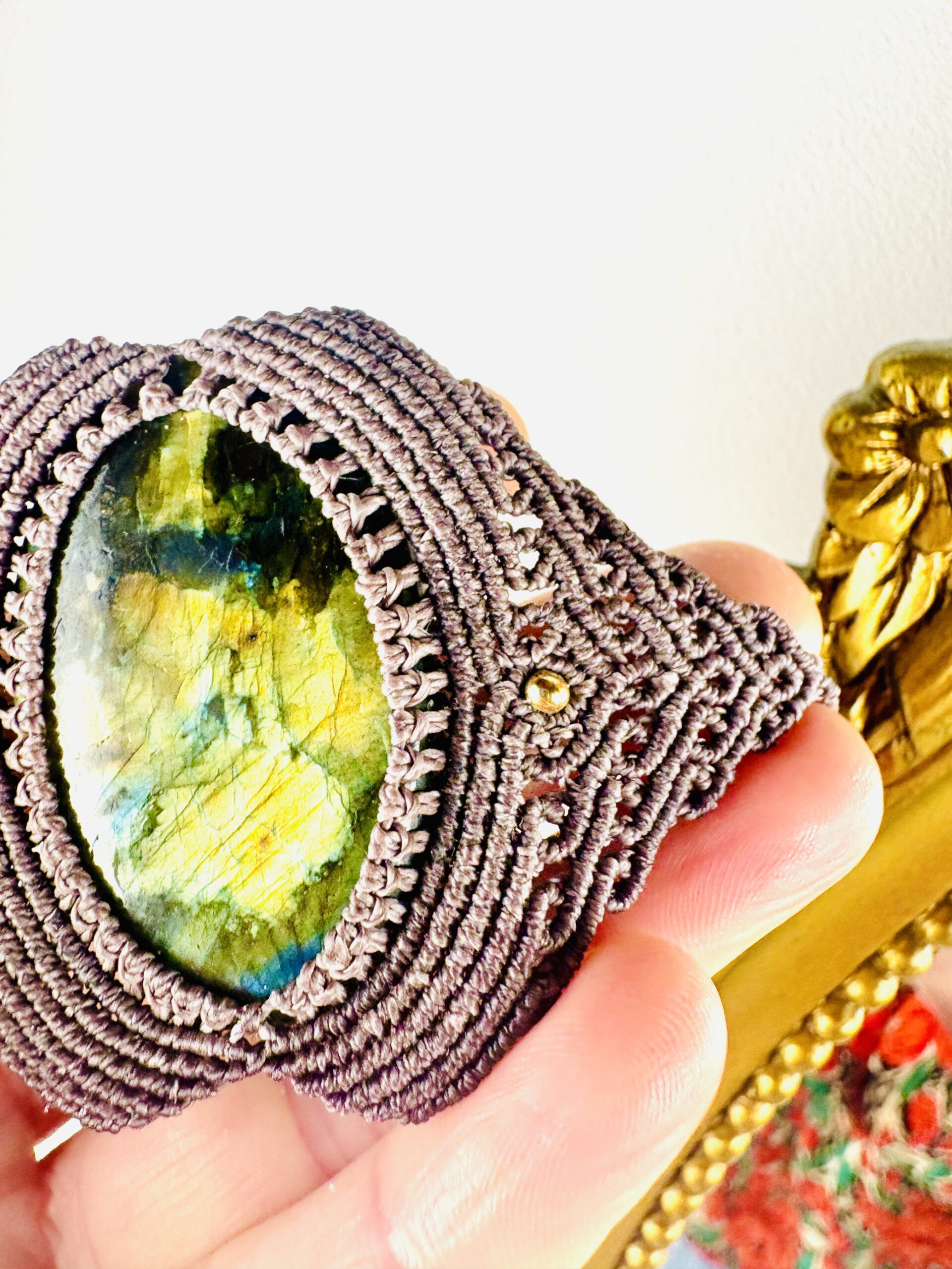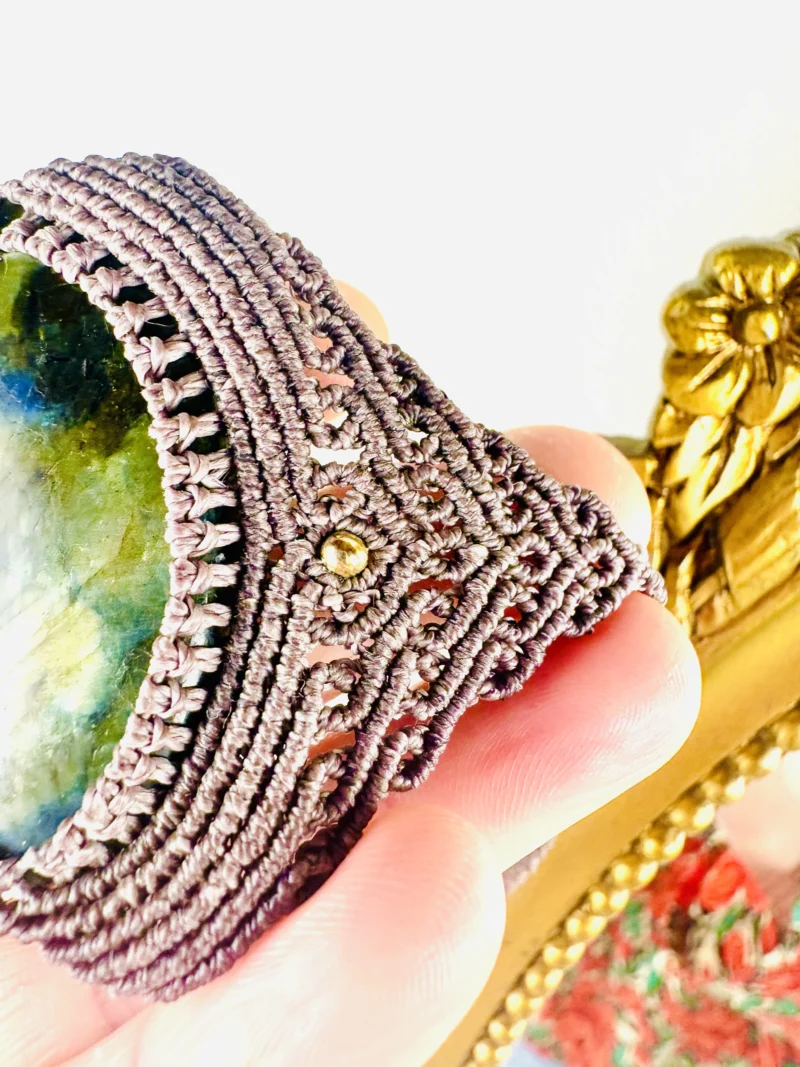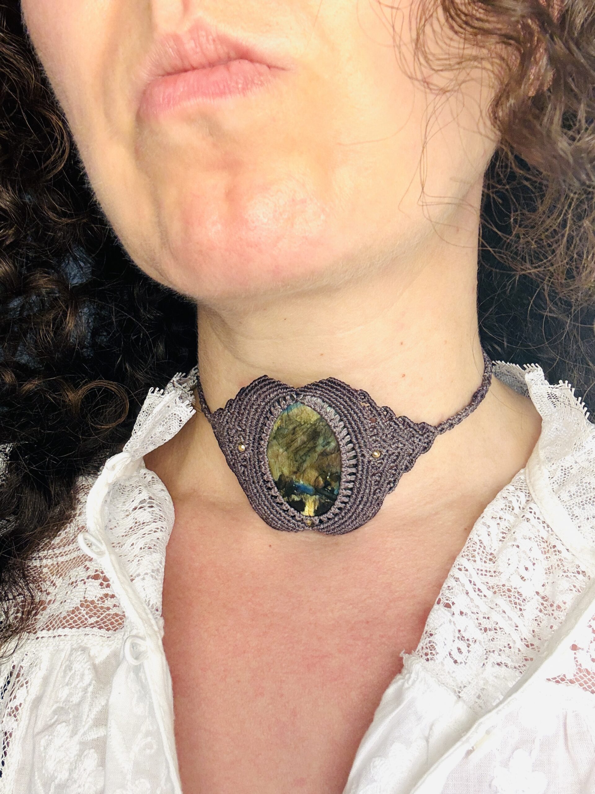 Ornée d’une somptueuse labradorite aux multiples reflets , ce chocker est soigneusement réalisé à la main, alliant l’art du micro macramé à la beauté naturelle de la labradorite, connue pour son rôle de bouclier contre les énergies négatives.