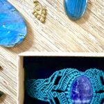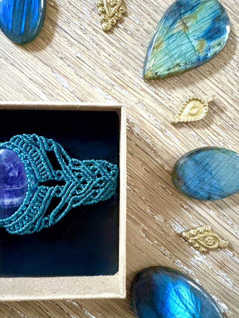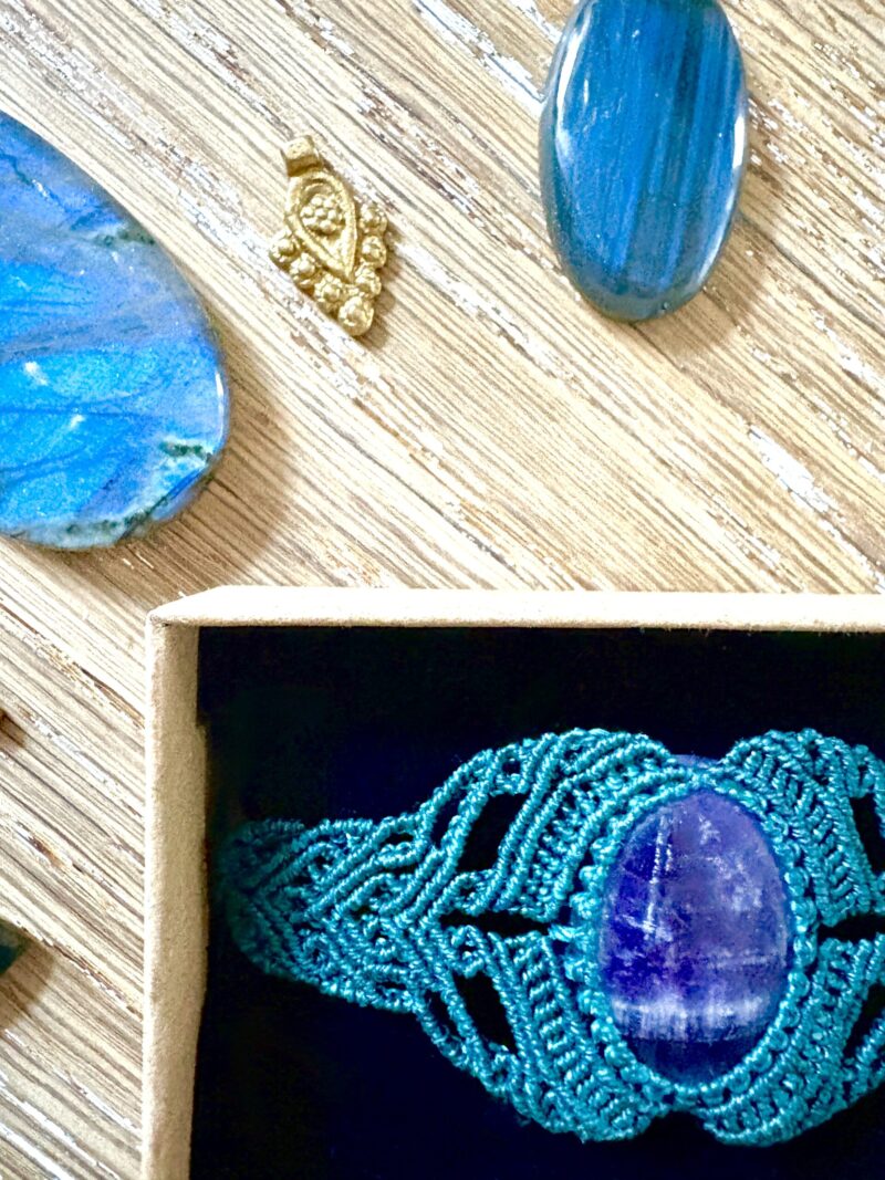 Orné d’un cabochon d’améthyste, chaque manchette est soigneusement réalisée à la main, alliant l’art du macramé à la beauté naturelle de l’oeil de tigre, connu pour éloigner les énergies négatives et créer un bouclier contre les influences indésirables. Cette manchette est montée sur un ravissant cabochon d’améthyste , accompagnée d’un délicat design arabesques.