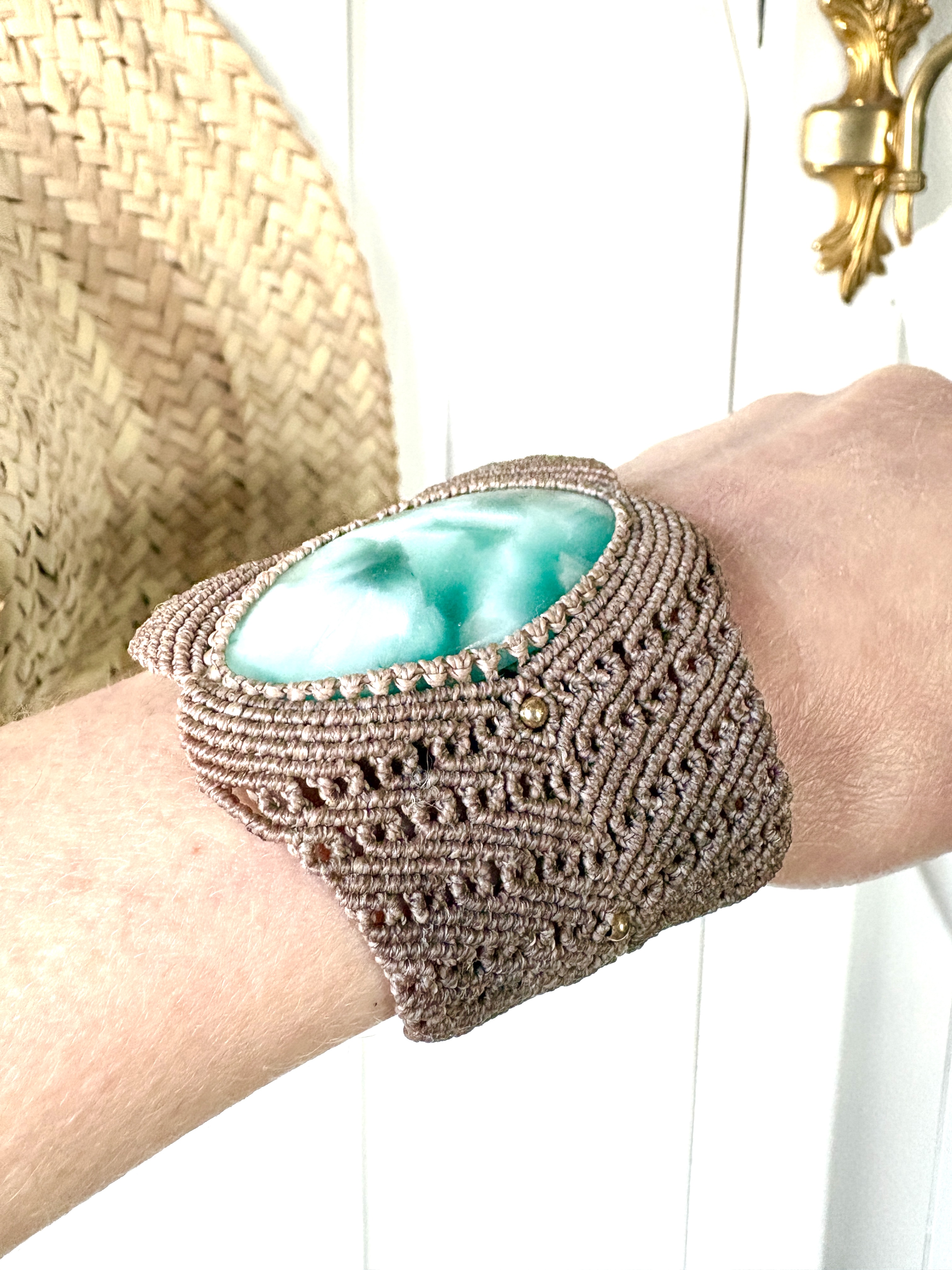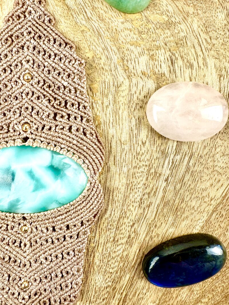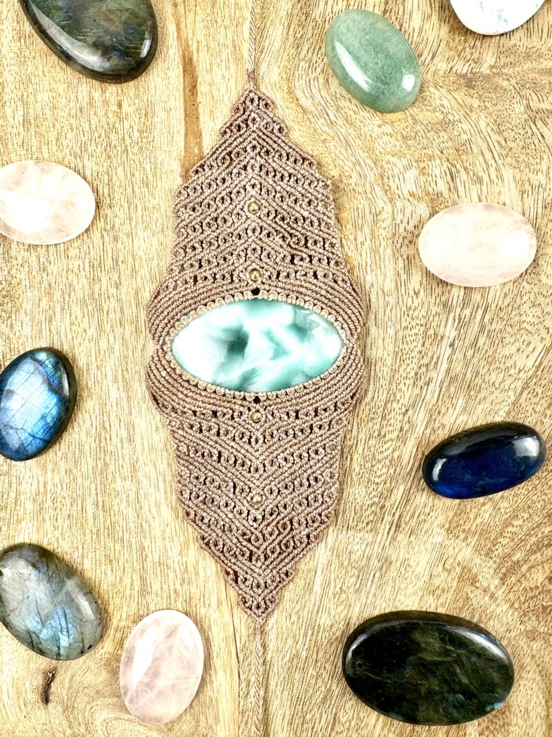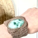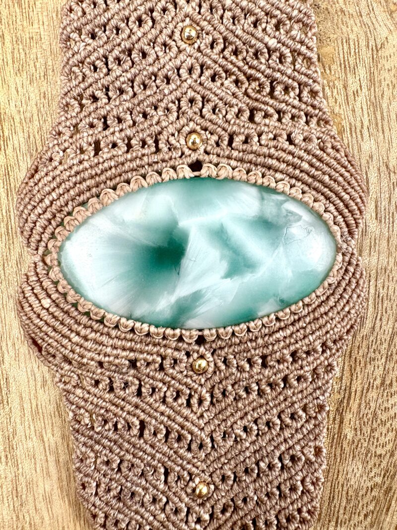 Ornée d’une somptueuse hémimorphite , cette manchette est soigneusement réalisée à la main, alliant l’art du micro macramé à la beauté naturelle de l’hémimorphite, connue pour favoriser l’apaisement.