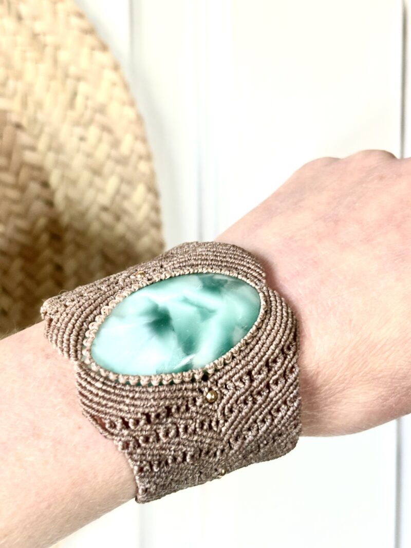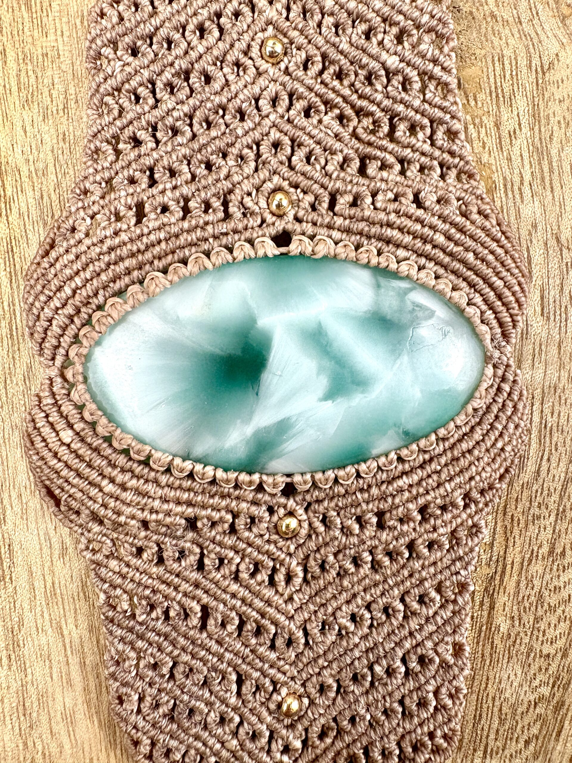 Fil ciré linhasita de couleur sable et cabochons d’hémimorphite, perles de laiton.