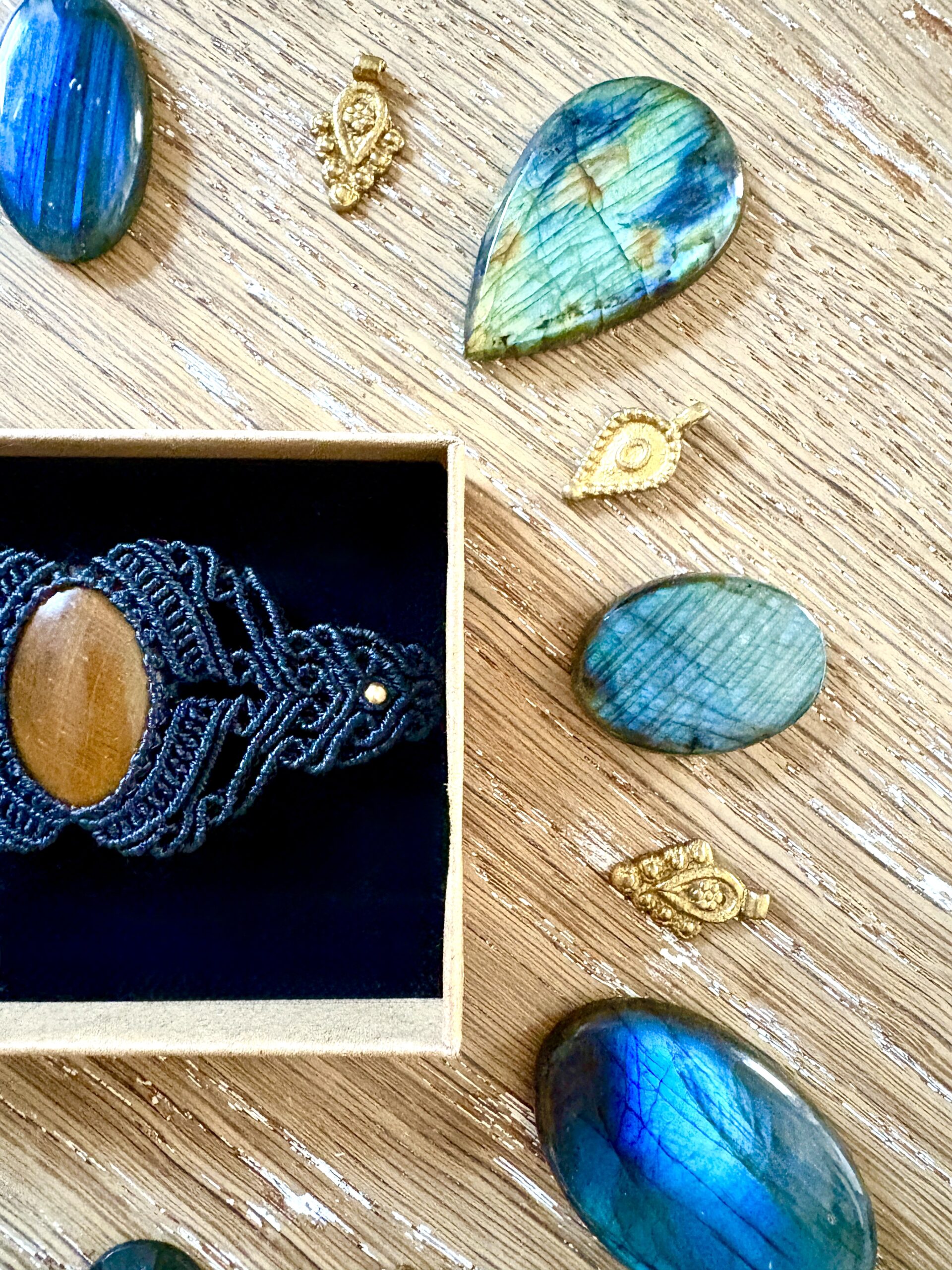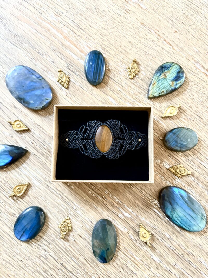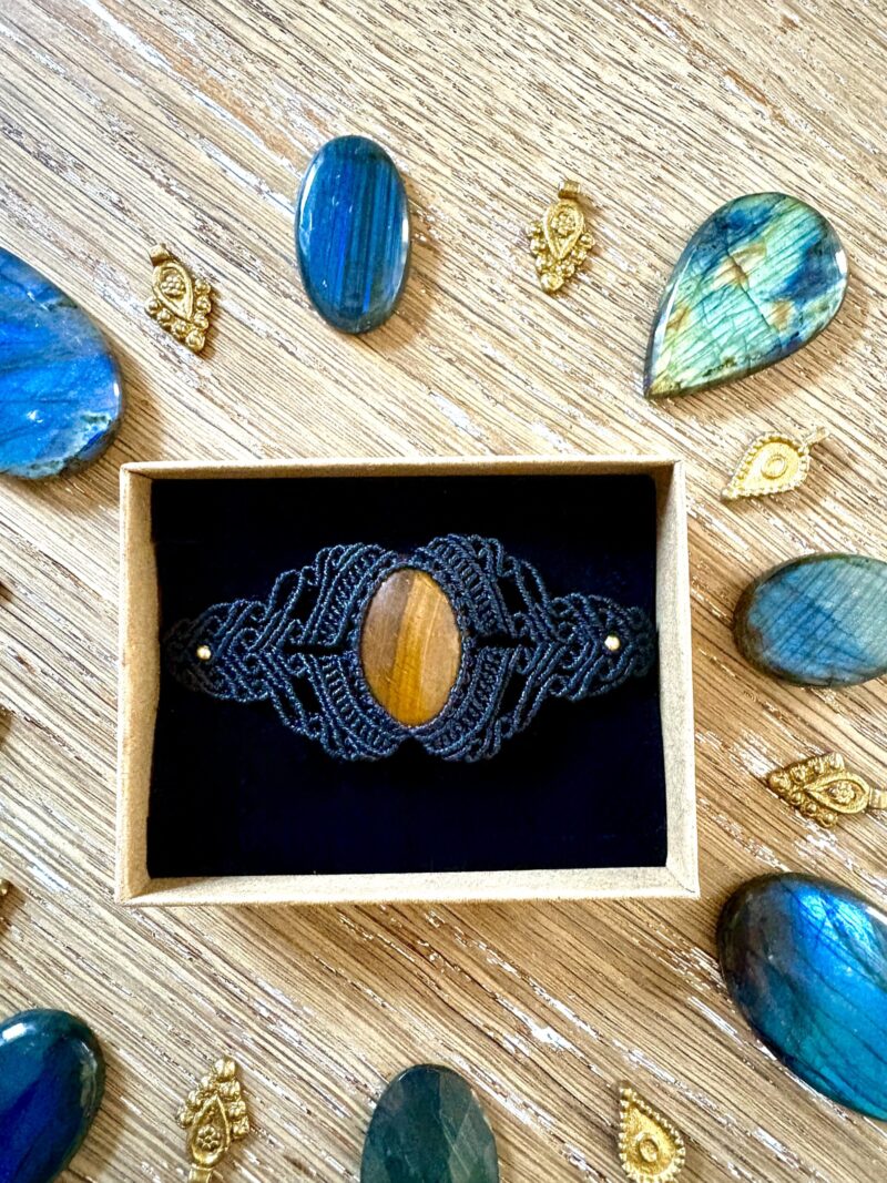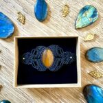 Orné d’un cabochon d’oeil de tigre, chaque manchette est soigneusement réalisée à la main, alliant l’art du macramé à la beauté naturelle de l’oeil de tigre, connu pour éloigner les énergies négatives et créer un bouclier contre les influences indésirables. Cette manchette est montée sur un ravissant cabochon d’oeil de tigre aux reflets dorés, accompagné d’un délicat design arabesques.