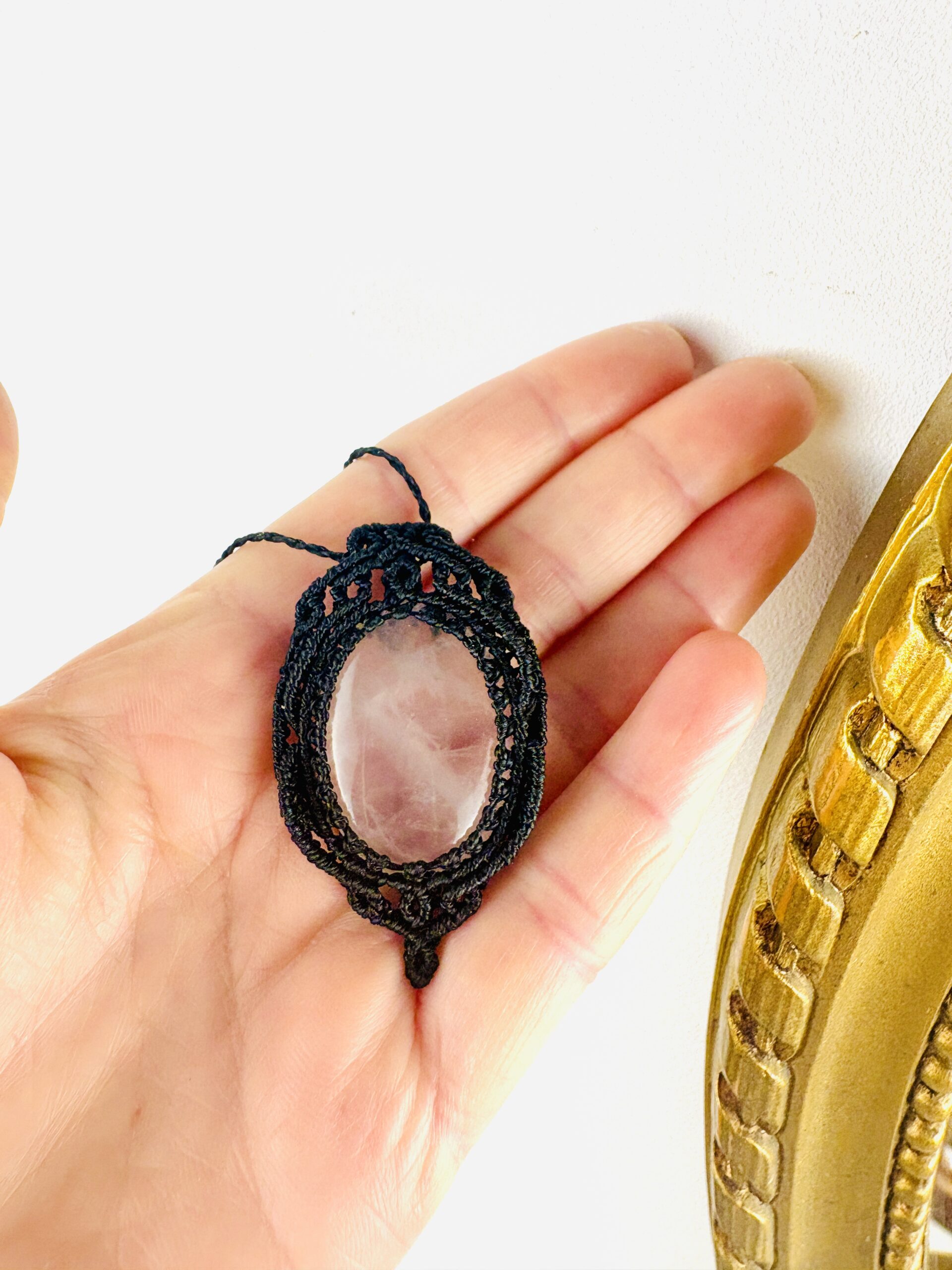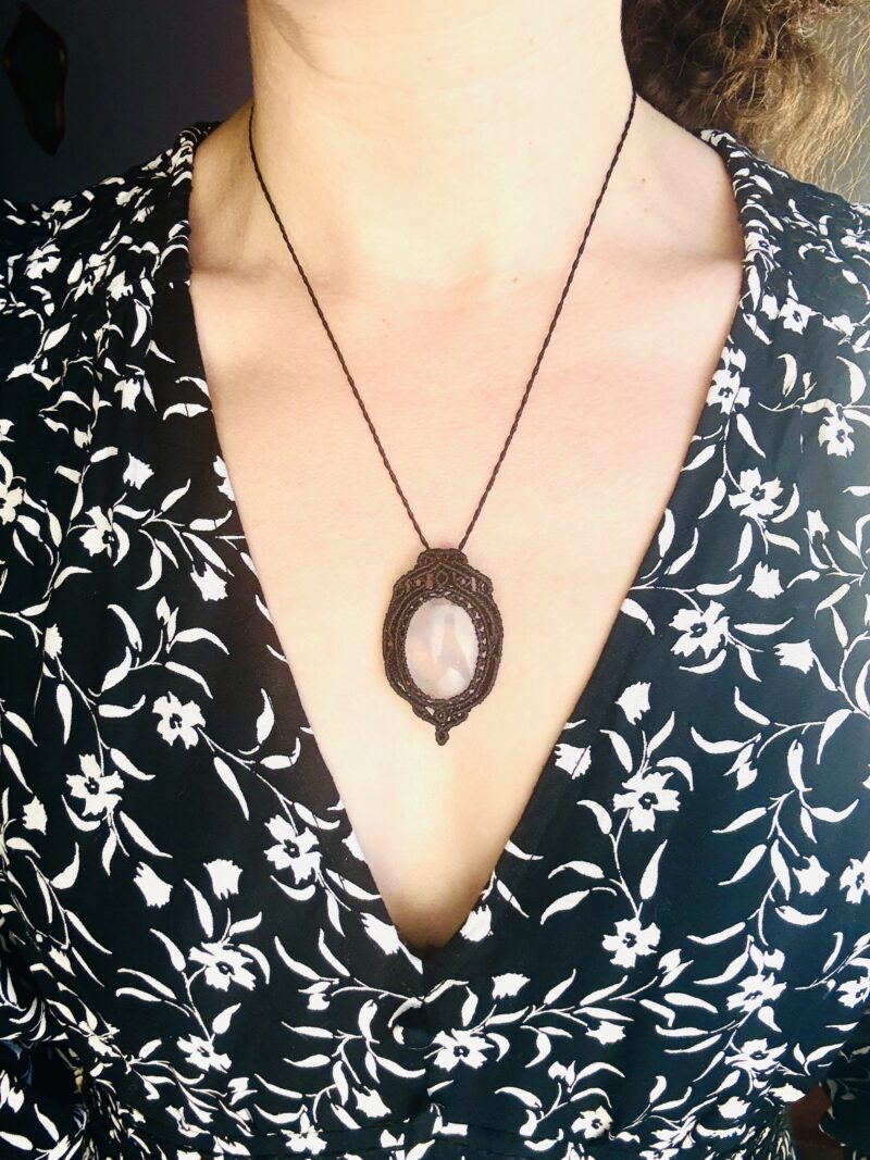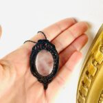 Orné d’un cabochon de quartz rose, ce médaillon est soigneusement réalisé à la main, alliant l’art du micro  macramé à la beauté naturelle du quartz rose,  connue pour rééquilibrer les énergies du corps afin d’apaiser l’esprit et favoriser le bien-être.