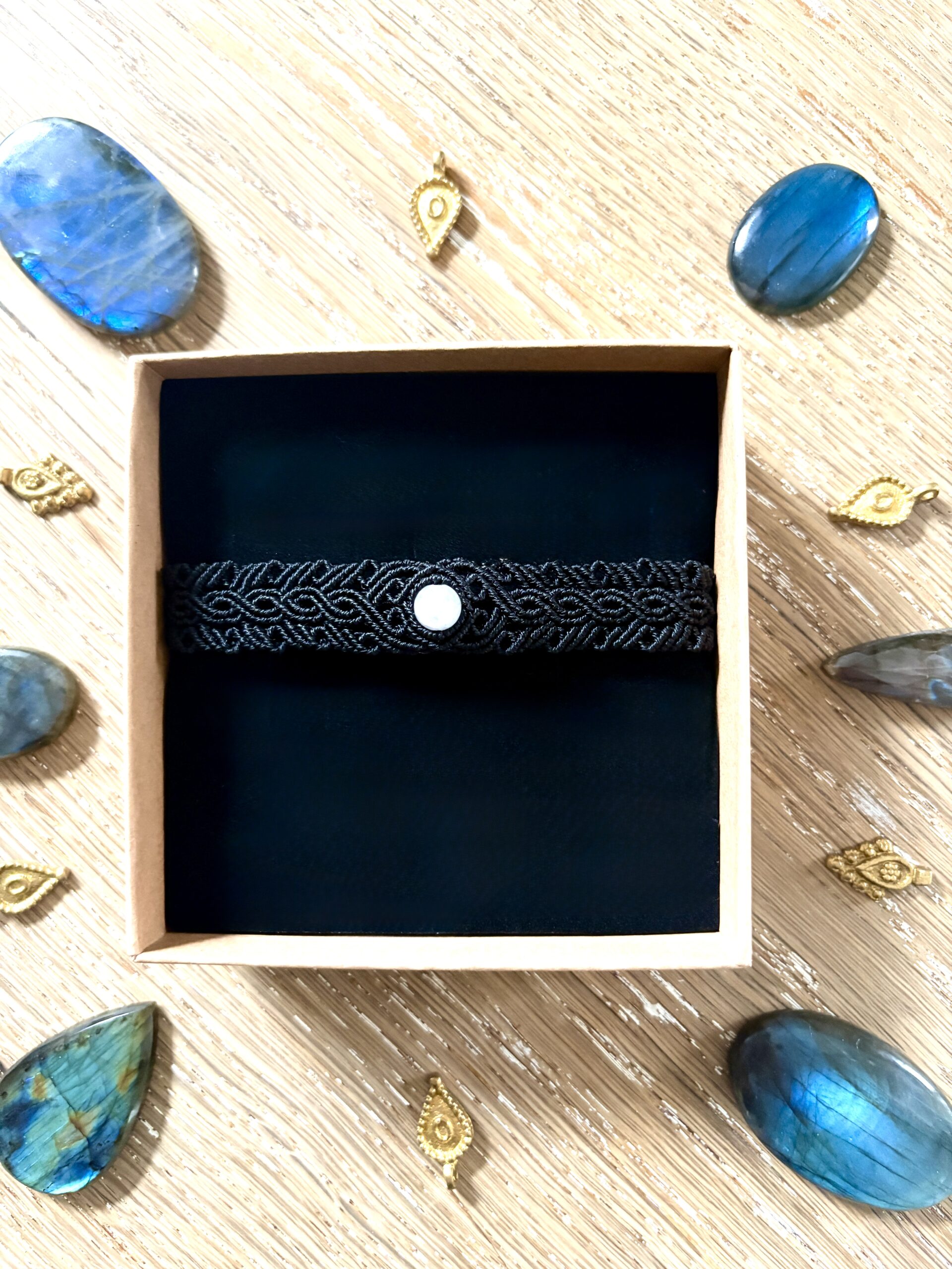 Orné d’une perle de quartz rose, ce ras de cou est soigneusement réalisé à la main, alliant l’art du micro macramé à la beauté naturelle du quartz rose, connue pour rééquilibrer les énergies du corps afin d’apaiser l’esprit et favoriser le bien-être.