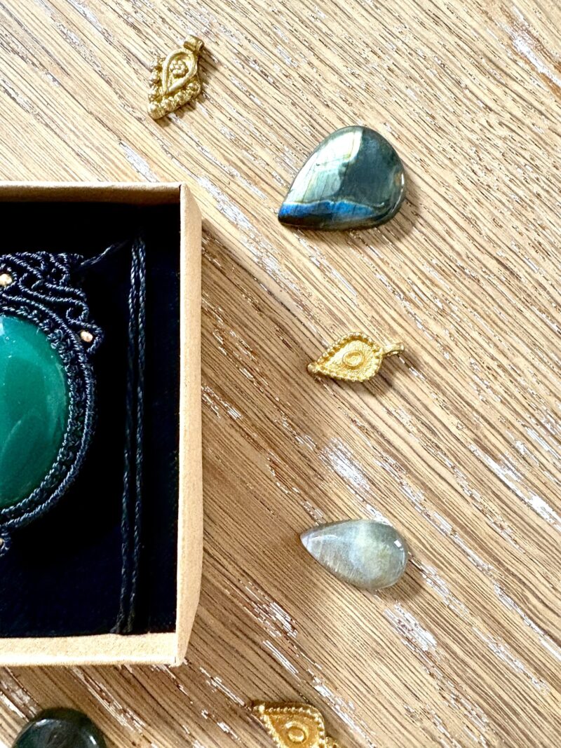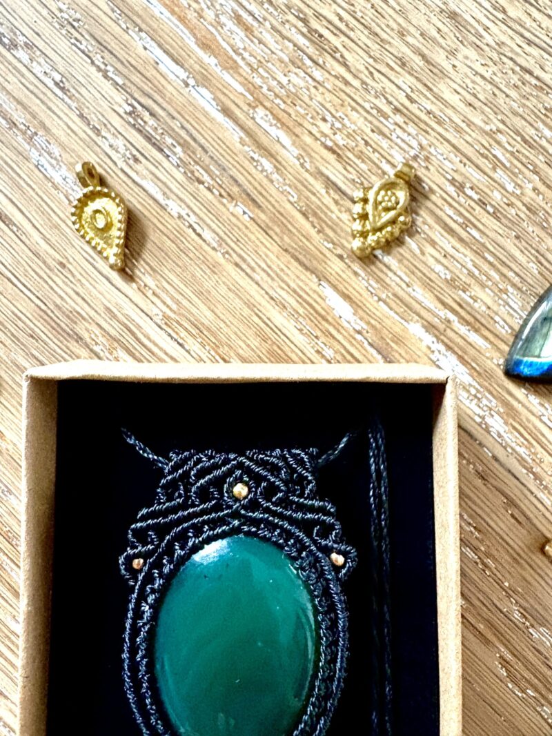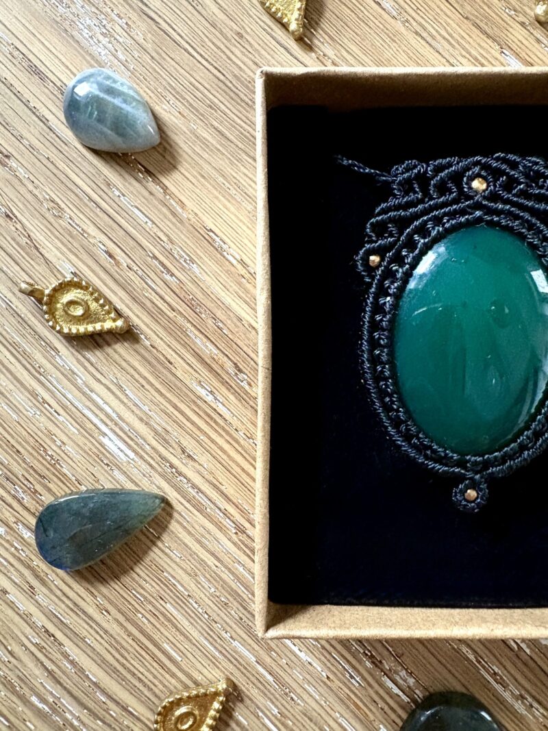 Ornée d’une somptueuse agate verte, ce talisman est soigneusement réalisé à la main, alliant l’art du micro macramé à la beauté naturelle de l’agate verte, connue pour dissiper l’anxiété et favoriser le bien-être.