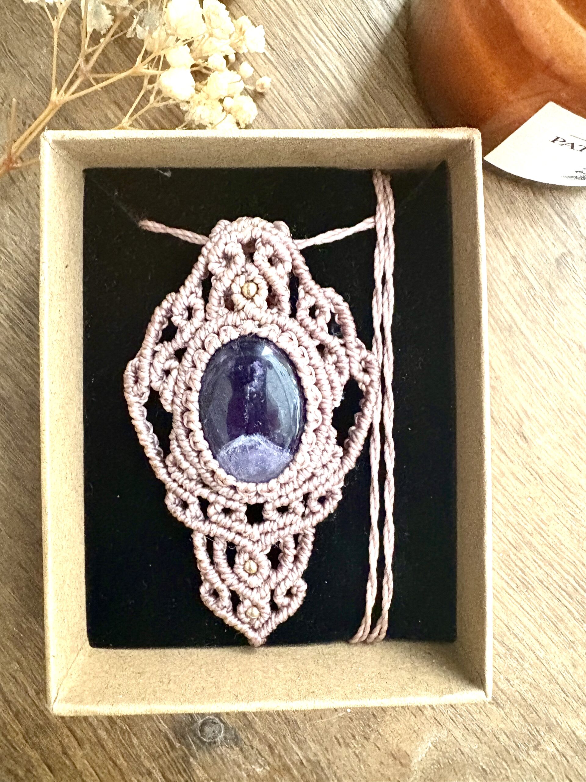 Talisman en macramé taupe avec améthyste, bijou artisanal unique aux vertus apaisantes. Élégant et intemporel, parfait pour offrir ou se faire plaisir.