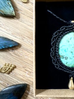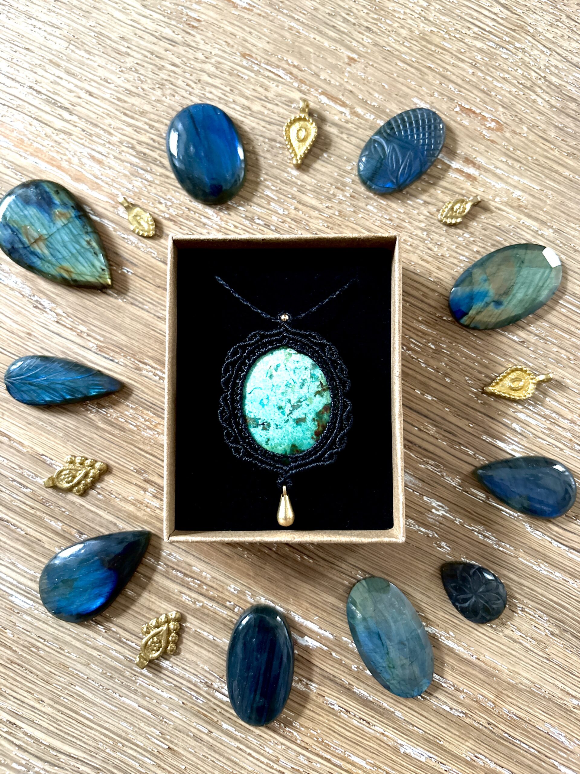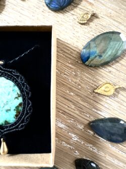 Ornée d’une somptueuse chrysocolle, ce talisman est soigneusement réalisé à la main, alliant l’art du macramé à la beauté naturelle de la chrysocolle, connue pour son rôle de neutralisateur des énergies négatives.