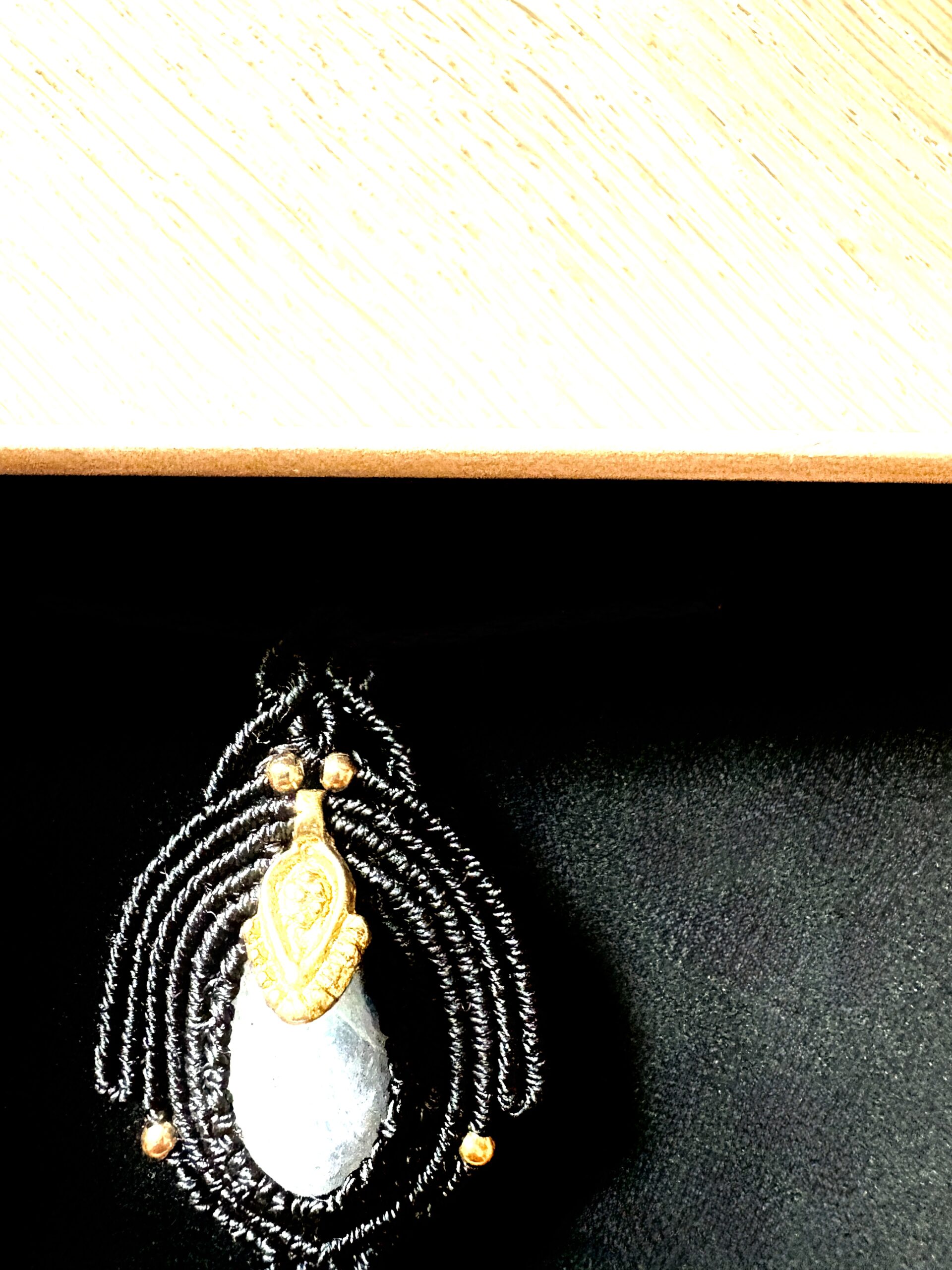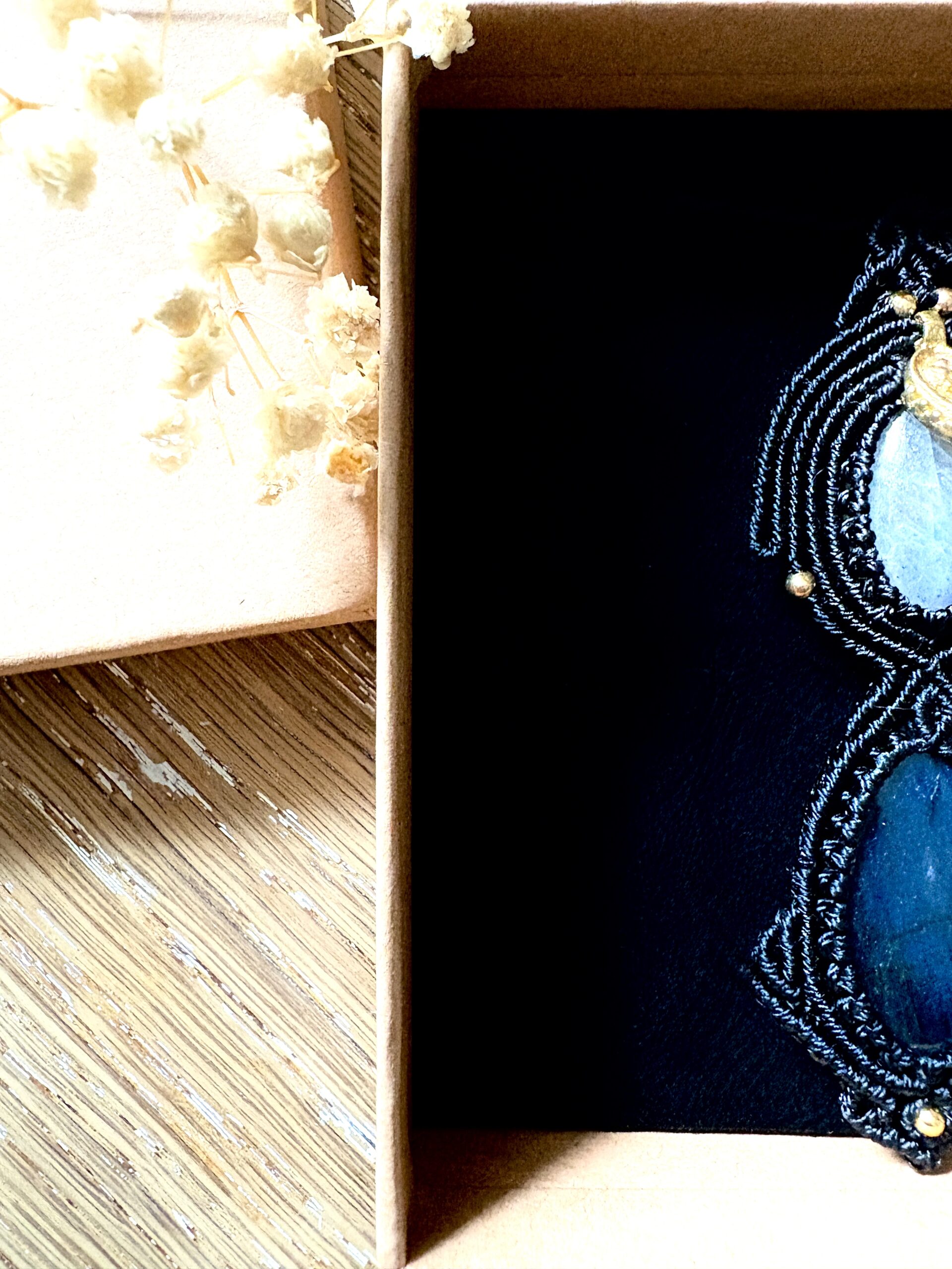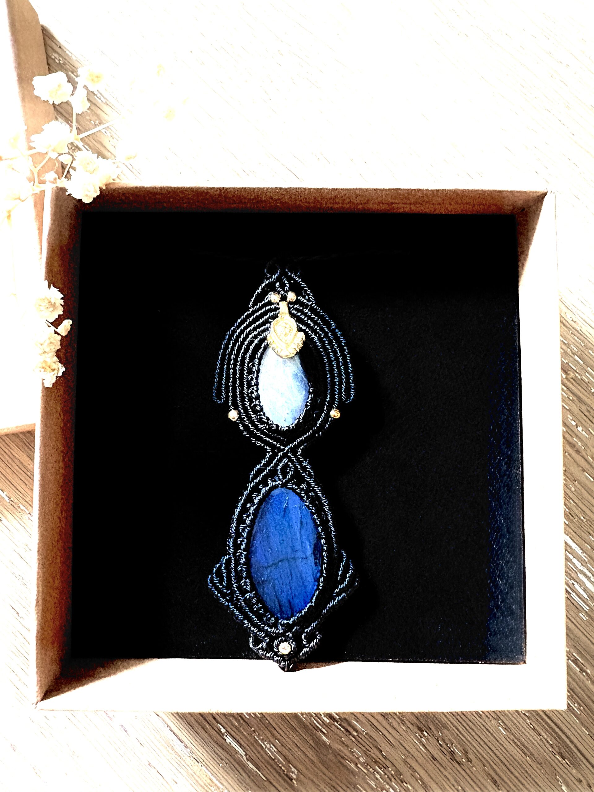 Ornée de deux somptueuses labradorites, ce talisman est soigneusement réalisé à la main, alliant l’art du macramé à la beauté naturelle de la labradorite, connue pour son rôle de bouclier contre les énergies négatives.Il se compose d’une labradorite grise en forme de goutte, d’une labradorite bleu en forme de goutte et d’une breloque indienne en laiton brut.
