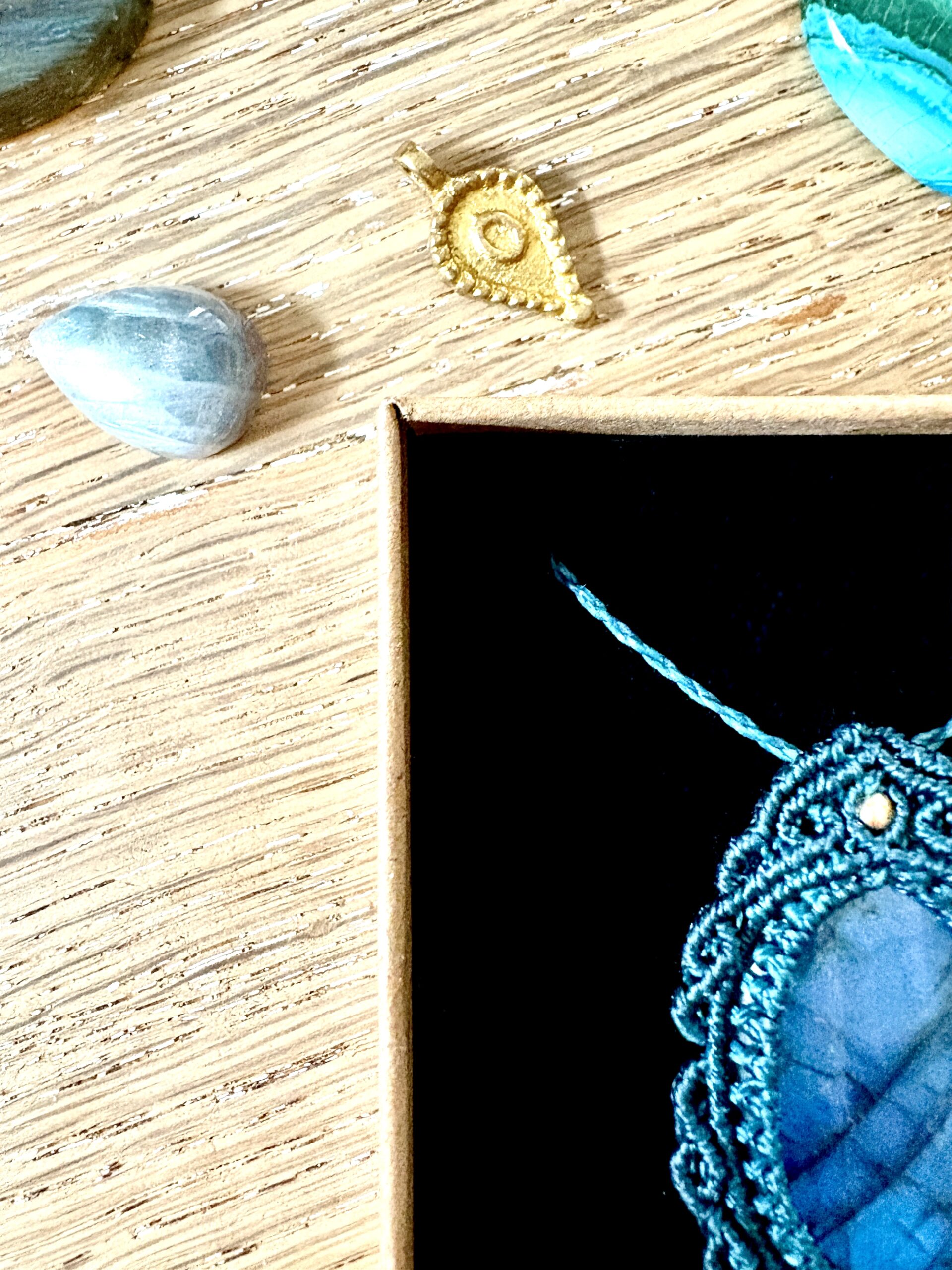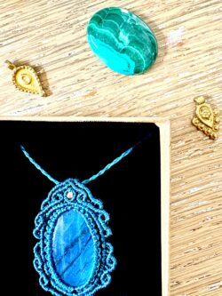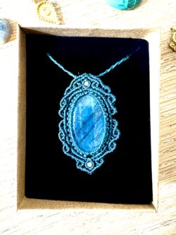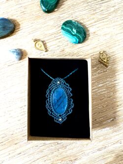 Ornée d’une somptueuse labradorite, ce talisman est soigneusement réalisé à la main, alliant l’art du macramé à la beauté naturelle de la labradorite, connue pour son rôle de bouclier contre les énergies négatives.