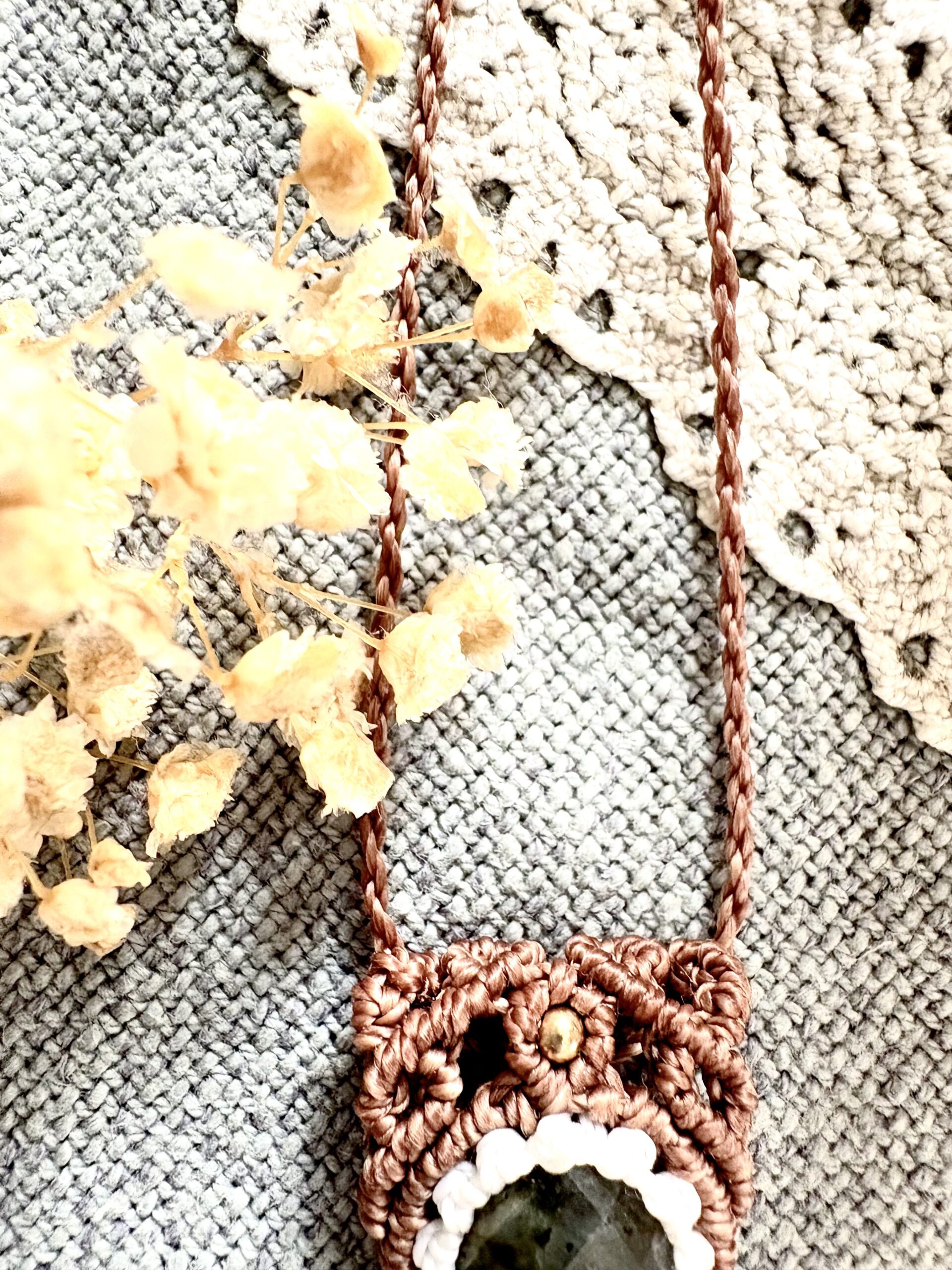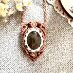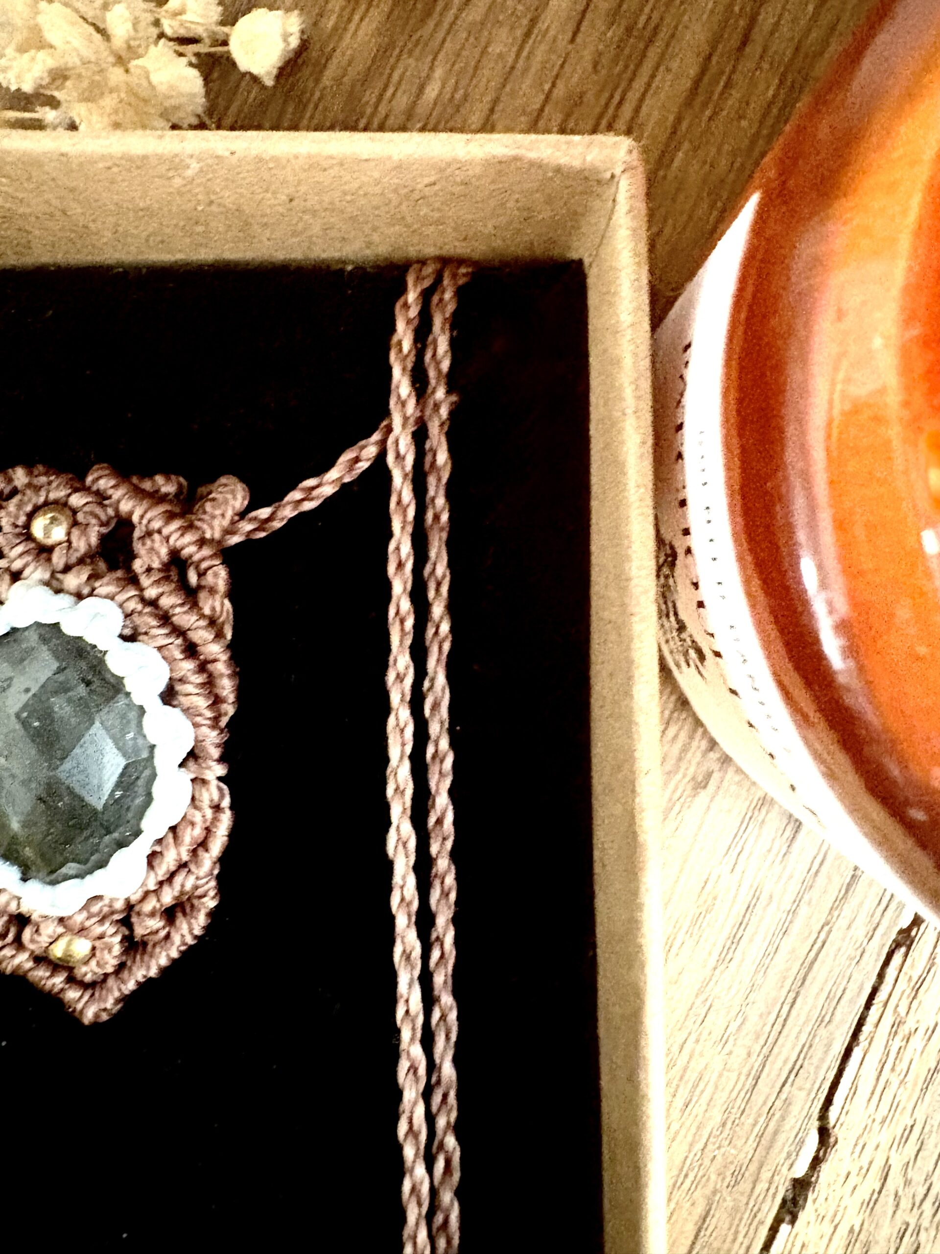 Ornée d’une somptueuse labradorite facettée. Ce pendentif est soigneusement réalisé à la main, alliant l’art du macramé à la beauté naturelle de la labradorite, connue pour son rôle de bouclier contre les énergies négatives.