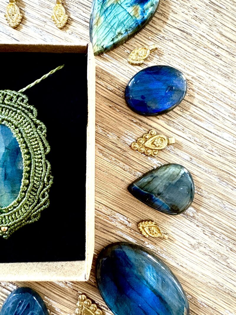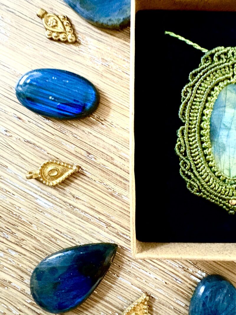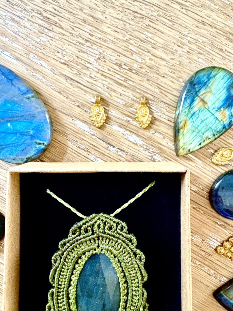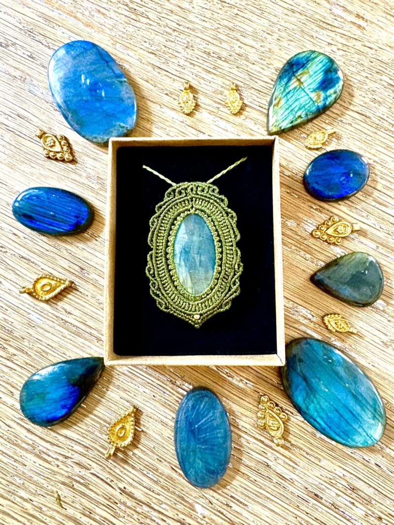 Ornée d’une somptueuse labradorite facettée, ce talisman est soigneusement réalisé à la main, alliant l’art du macramé à la beauté naturelle de la labradorite, connue pour son rôle de bouclier contre les énergies négatives.