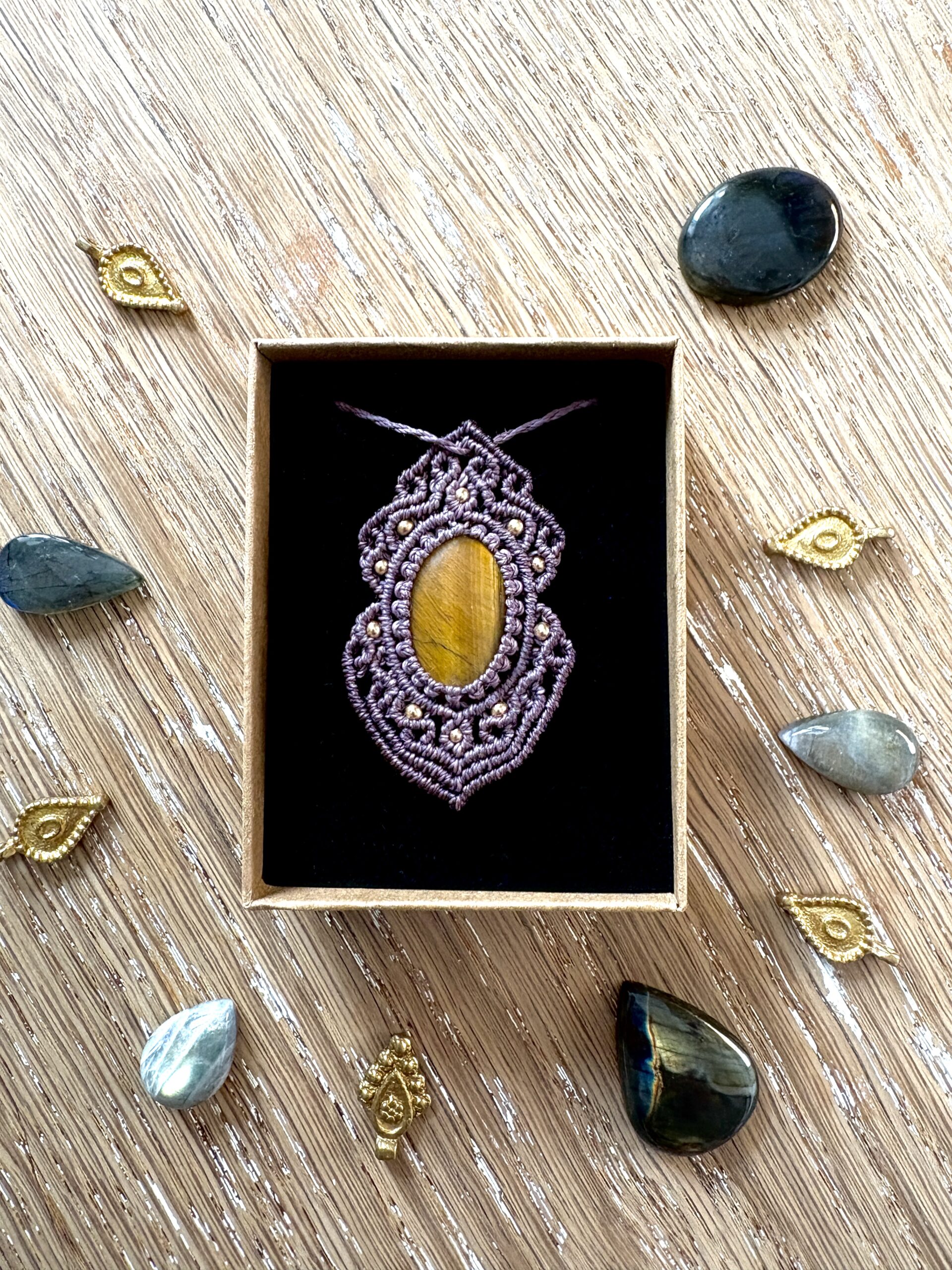 Orné d’un cabochon d’oeil de tigre, chaque talisman est soigneusement réalisé à la main, alliant l’art du macramé à la beauté naturelle de l’oeil de tigre, connu pour éloigner les énergies négatives et créer un bouclier contre les influences indésirables. Ce talisman est monté sur un ravissant cabochon d’oeil de tigre aux reflets dorés, accompagné d’un délicat design arabesques.