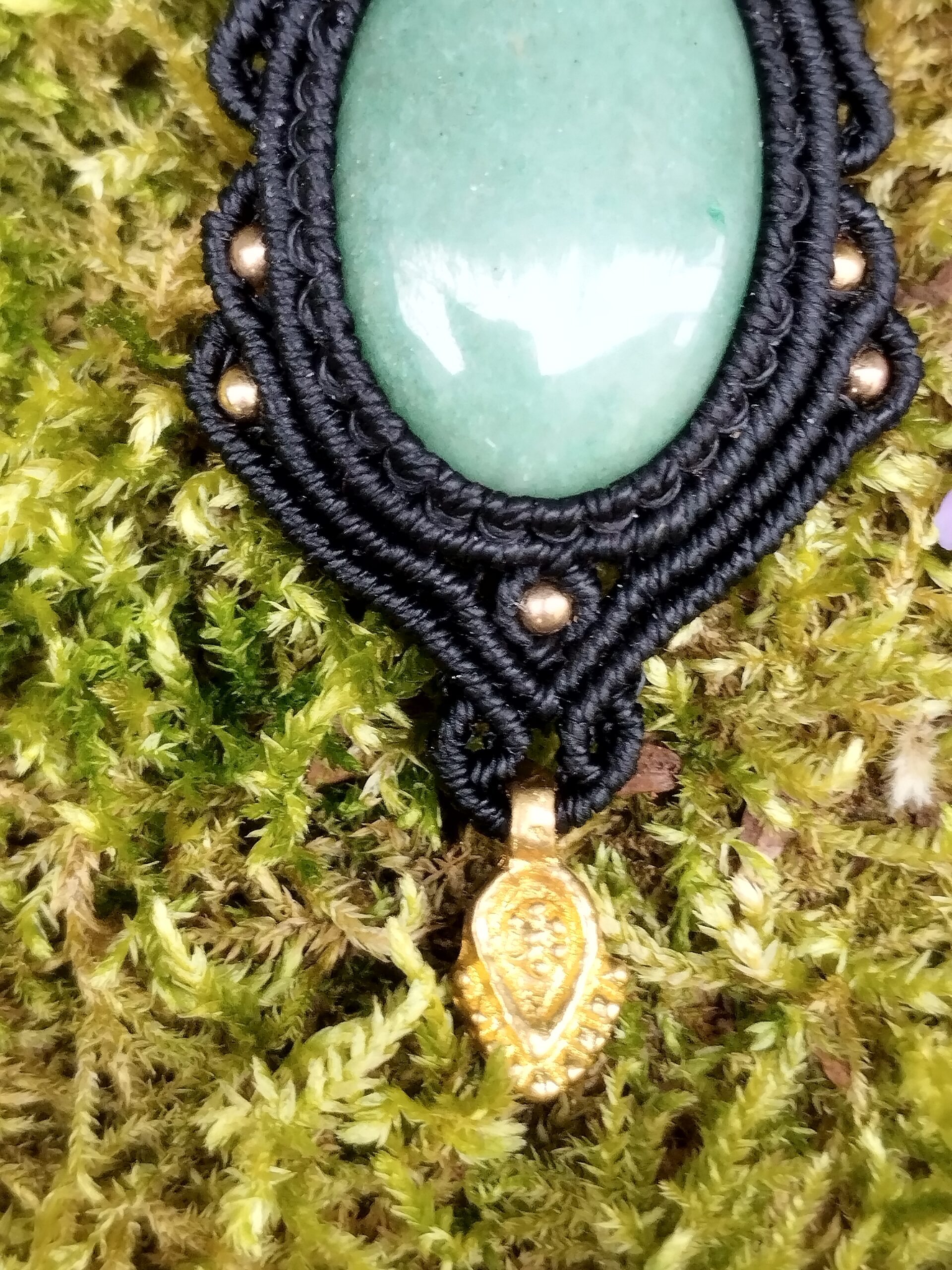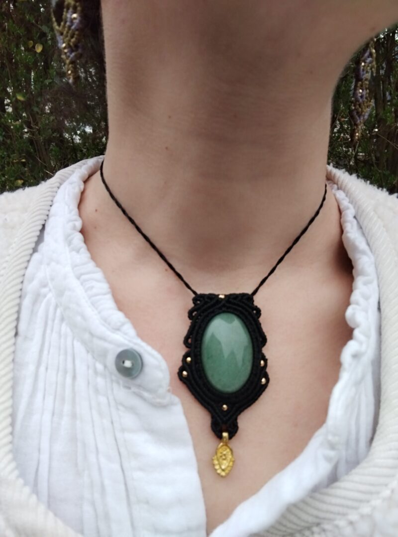 Talisman noir en macramé avec aventurine verte, bijou artisanal unique aux vertus apaisantes et porte-bonheur. Élégant et idéal à offrir.